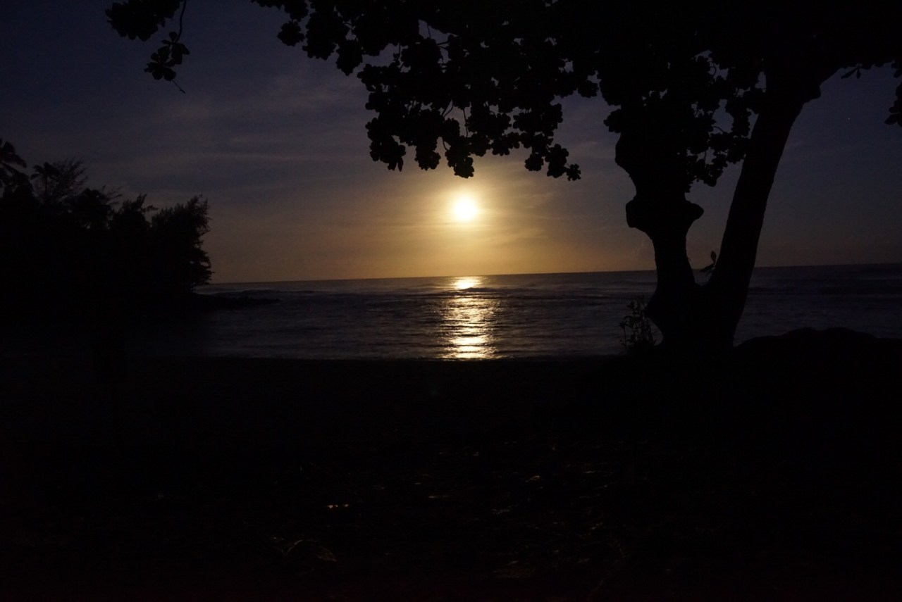 Yes, it looks like the sun setting but this photo was taken before dawn, just as the moon was setting off of Ke’e Beach.