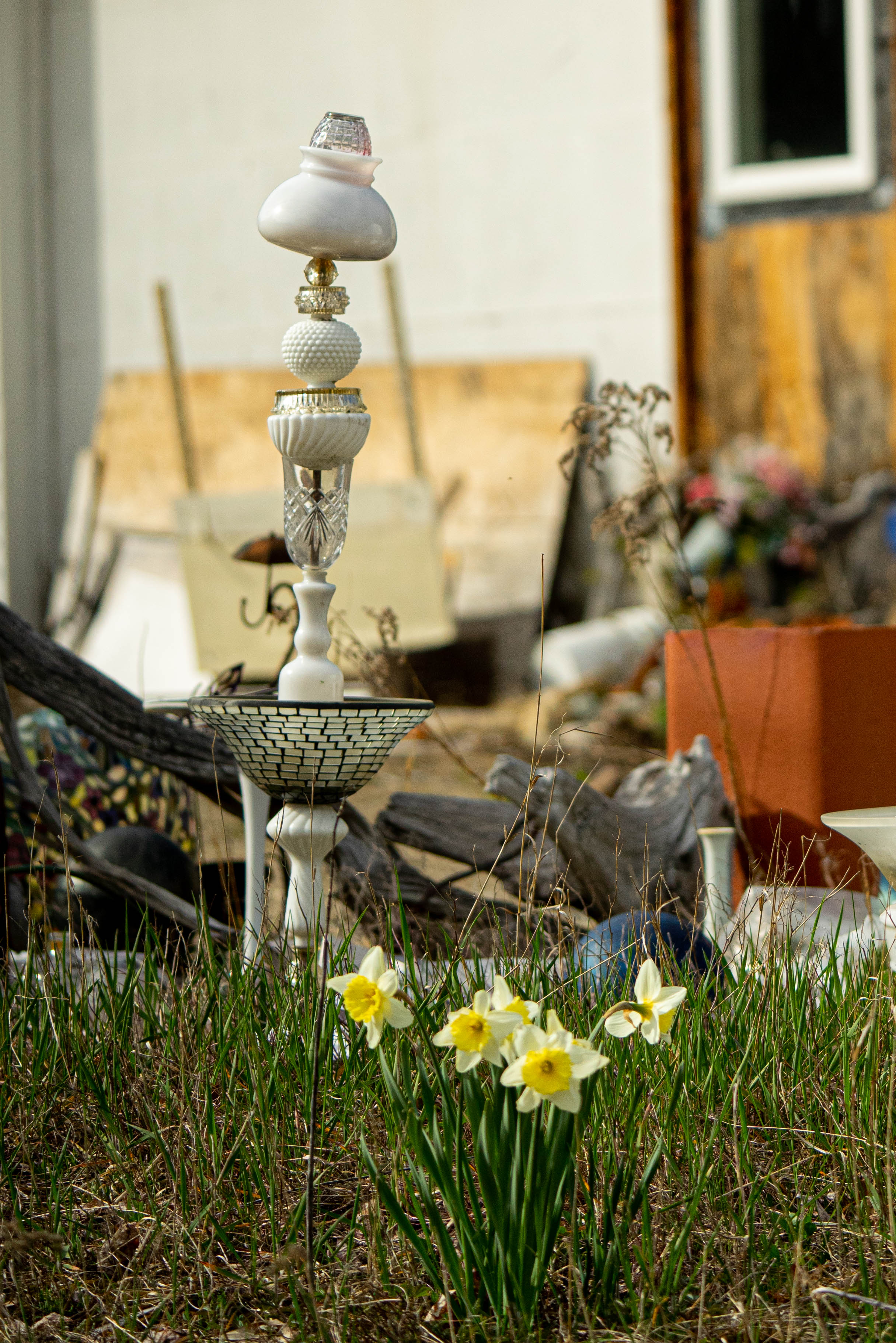 8.5 miles, same direction as yesterday. Why? Yesterday I brought only one lens with me and unfortunately, a place I thought would garner great photos did not have the desired results so I decided to return today. As much as yesterday’s painted rocks may lead us to the question of why are they there at the base of the tree, much can be asked about today’s photos. Primarily, is this art? For anyone who has driven north on Route 4 through Salisbury, I’m sure you have seen the garage and glass managerie on the lawn near the road. Some might drive by and think it disgraceful, ugly, a dump. I drove past and said, hmmmmm what is this? A glass lampshade garden? So I stopped, grabbed my camera and photographed and admired the artist’s work – because if you look closely at this garden, there is art hidden inside that yard. As I photographed from the side of the road, and the edge of their drive, I had to wonder if seen, would they have shooed me off thier property or been pleased that someone appreciated their artwork.