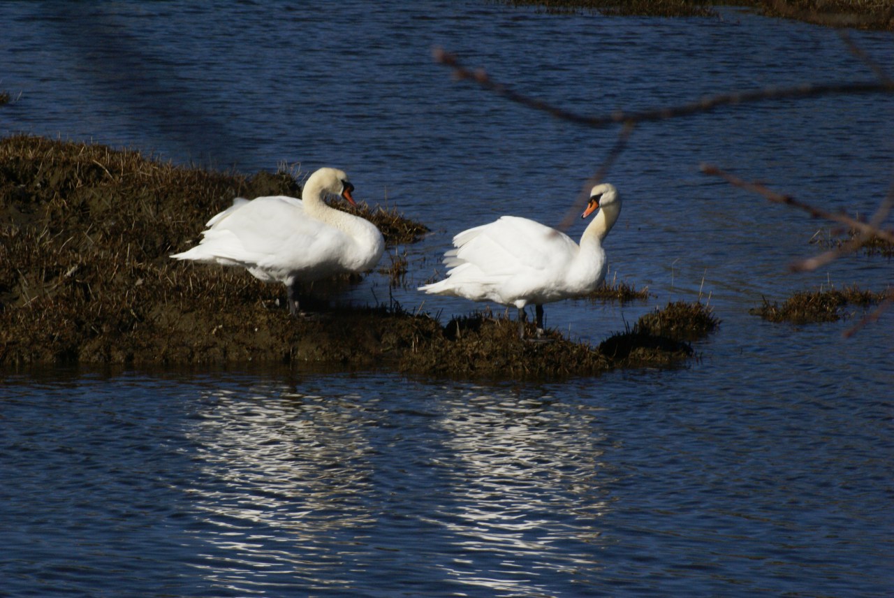 These two Mute swans spent so much time preening themselves that it took a considerable amount of patience on my part to catch this photo with their heads out from under their feathers.